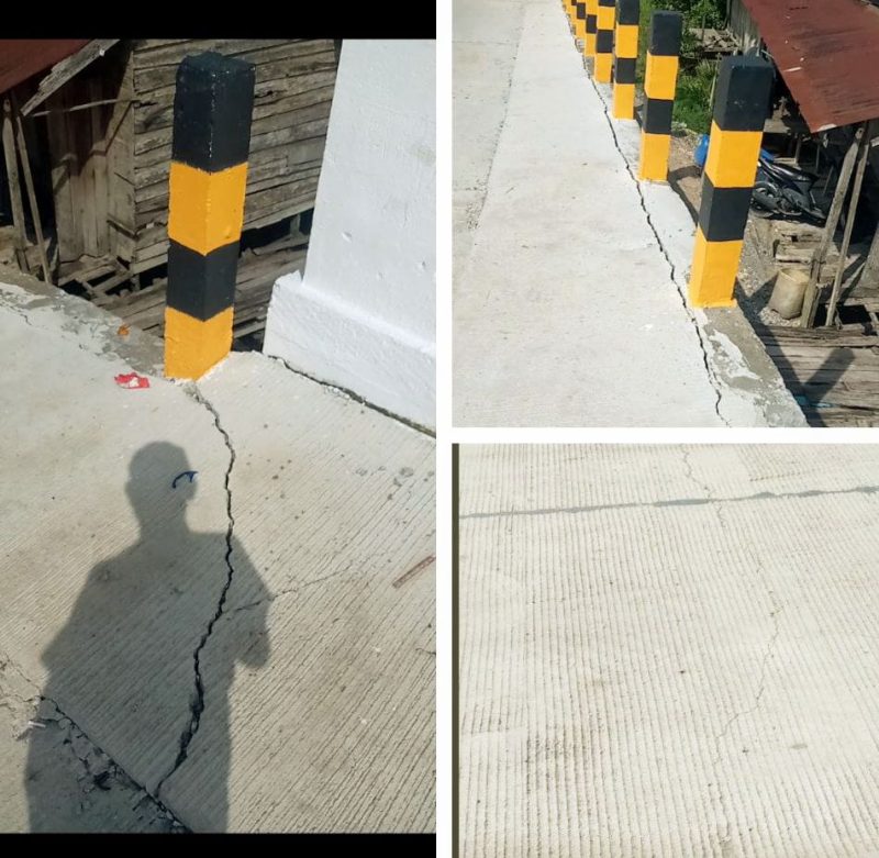 Jembatan yang baru saja selesai dibangun pada tahun lalu ternyata tidak hanya mengalami kerusakan pada satu titik. Tim awak media yang turun langsung ke lokasi menemukan beberapa bagian jalan jembatan menuju Kelurahan Roro, Kampung Nelayan sudah terlihat jelas retakan dan bagian permukaannya yang terkupas.