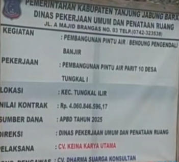 TANJAB BARAT, LIPUTAN JAMBI. ID– Proyek pembangunan pintu air di Parit 10, Desa Tungkal 1, Kecamatan Tungkal Ilir, Kabupaten Tanjung Jabung Barat (Tanjabbar) yang digarap pada anggaran tahun 2025 senilai Rp4 miliar lebih masih menjadi tanda tanya besar bagi publik.