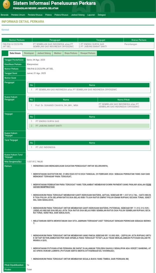 Tanjab Barat --Badan Usaha Daerah (BUMD) milik Pemerintah Kabupaten Tanjung Jabung Barat (Tanjabbar), yaitu PT Jabung Barat Sakti, digugat ke Pengadilan Negeri (PN) Jakarta Selatan (Jaksel) terkait dugaan wanprestasi. Pihak penggugat adalah PT Sembilan Gas Indonesia atau PT Sembilan Gas Indonesia Cryogenic.…